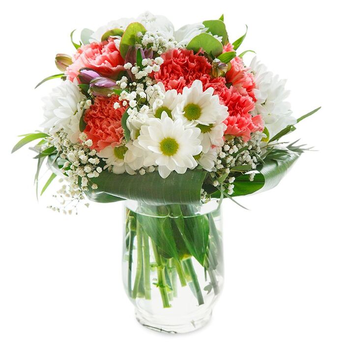 There is an immediate sense of happiness and renewal as this vibrant bouquet unfolds from a simple white gift bag, its floral artistry crafted with the bright, community spirit of Bellingham in mind. Soft ruffles of coral and red carnations appear almost sun-kissed, their rich petals opening outward with generous warmth that brings to mind the blossom-laden pathways of Beckenham Place Park. Bright white daisies, each with a lively yellow-green heart, dance among the larger blooms, evoking the optimistic freshness of spring mornings in SE6. Wispy trails of baby's breath add a delicate grace, their tiny blossoms floating like gentle laughter in a local cafe. Along the sides, hints of purple-hued buds tease with promises of even greater beauty soon to come. All these elements rest upon a bed of glossy, deep green leaves, their sheen reminiscent of early dew on Bellingham's tree-lined streets. The floral mix is presented in a sturdy yet refined white gift bag, its ribbon handles poised for a journey to celebrate a birthday, an anniversary, or to simply light up a neighbour's day. The entirety is set against a flawless white backdrop, inviting full attention to the bouquet's fresh colours and joyful structure. Every stem, every petal, and every detail has been thoughtfully arranged-reflecting both the artistry of a local florist and the heartfelt intentions that make flower giving so meaningful in Bellingham. This bouquet is the very picture of spring's radiance-a vibrant, thoughtfully arranged celebration crafted by local Bellingham florists for moments of joy and renewal. At its centre, lively white daisies with gleaming green centres spread their petals wide in friendly invitation, as if echoing a bright morning in the heart of Bellingham. Encircling them, a ring of coral-pink carnations bursts with ruffled softness, their textured petals lending depth and cheerful energy. Interlaced amid the larger blooms, fine sprigs of gypsophila float like miniature stars, creating dreamy movement and a feeling of effortless lightness. Subtle blush-pink alstroemeria buds and matte eucalyptus leaves are tucked between blossoms, adding both a gentle, cooling aroma and pleasing tonal balance. The greens frame the whole with lush structure, reminiscent of the leafy neighbourhood roads in SE6. This fresh, delightful arrangement feels perfect for congratulating a neighbour, celebrating a milestone, or simply bringing the spirit of Bellingham into someone's day. The overall effect is tranquil yet radiant, a testament to the local florist's devotion to crafting happiness with flowers-an ideal choice for delivery in Bellingham, where heartfelt details matter most. Radiating freshness and understated joy, this bouquet feels like the arrival of a gentle spring day in Bellingham, where gardens burst into colour along quiet neighbourhood lanes. At its heart, coral-hued carnations, soft and ruffled, create an exuberant centrepiece surrounded by crisp white chrysanthemums and daisy-like blooms, their lively green centers gleaming with optimism. Wispy trails of baby's breath intermingle with the larger flowers, lending the design a light, cloudlike softness that mellows the arrangement's boldness. Glossy, deep green leaves frame the bouquet, their smooth and textured surfaces playing with the light, while slender leafy accents thread upward, reinforcing the bouquet's fresh, organic charm. Emerging magenta alstroemeria buds provide a fascinating accent, suggesting that the bouquet, like the ever-changing seasons in Bellingham's local parks, will continue to reveal its beauty. The clear glass vase is brimming with clean water, revealing the sturdy green stems below-symbols of vitality and artisanal care. Bright, even lighting ensures that every petal and leaf is fully realised against the pristine background, making the flowers feel as if they're glowing from within. Whether chosen as a birthday gift or a gesture of kindness to a neighbour on Bromley Road, this thoughtfully arranged display offers a vibrant welcome, promising positivity and comfort within any home throughout Bellingham.