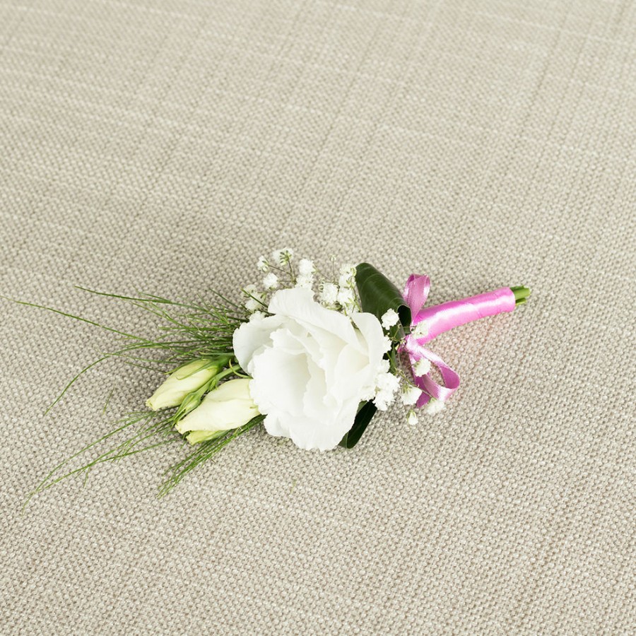 Step into a world of elegance with our refined floral buttonhole. Expertly crafted from white lisianthus, delicate gypsophila, and elegant aspidistra leaves, this arrangement epitomizes sophistication and class. Each flower is carefully hand-selected for its freshness and vibrant beauty, ensuring your wedding accessory looks its absolute best.